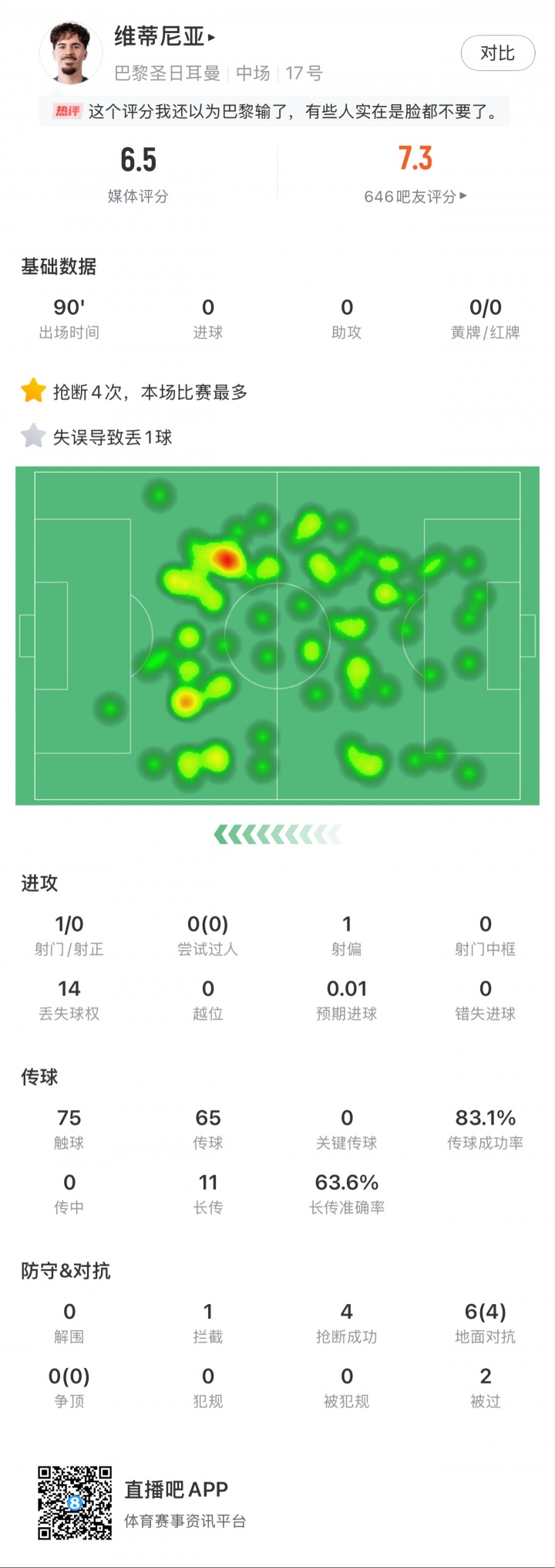 维蒂尼亚则是打满全场获评6.5分,1次射门0射正,14次丢失球权,75次触球,65次传球54次奏效,传球奏服从83.1%,0次关键传球,11次长传7次奏效,长传准确率63.6%,1次禁锢,4次抢断奏效(全场最多),6次大地抵拒4次奏效,2次被过,1次差错导致丢球。