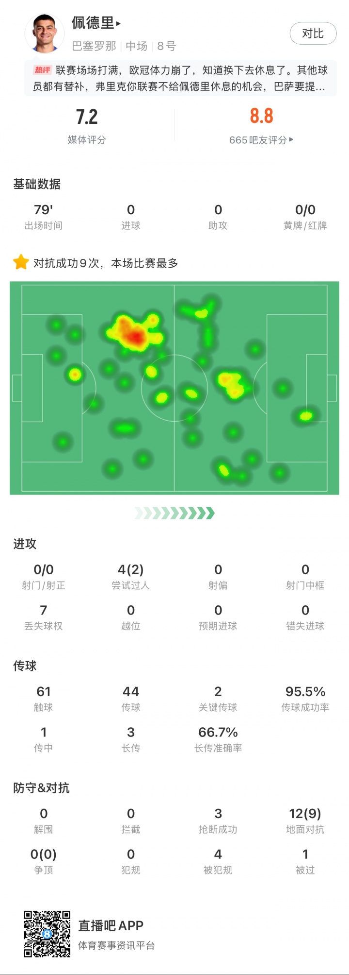 本场比赛,佩德里出战79分钟获评7.2分,4次尝试过东说念主2次奏效,7次丢失球权,61次触球,44次传球42次奏效,传球奏服从95.5%,2次关键传球,3次长传2次奏效,长传准确率66.7%,3次抢断奏效,12次大地抵拒9次奏效(全场最多),4次被犯规,1次被过。