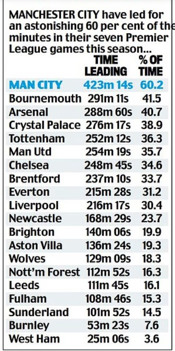 尽管当今在积分榜上只可位居第5,但曼城的朝上本领达到了423分钟14秒,占总比赛本领的60.2%,伯恩茅斯、阿森纳和水晶宫是前四中的另外三支球队。曼联当今在积分榜上位居第10位,但他们在比赛中的朝上本领不错在20支球队中位居第5。