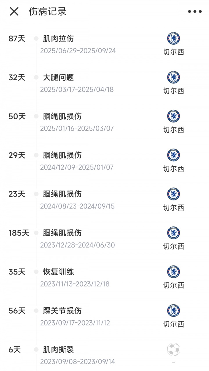 21岁拉维亚自2023年8月18日加盟切尔西以来,一共受伤9次,总天数累计503天,错过了77场比赛,2年多以来统共只为切尔西出战30场比赛,0球1助。他的伤情主如若腘绳肌和拉伤。