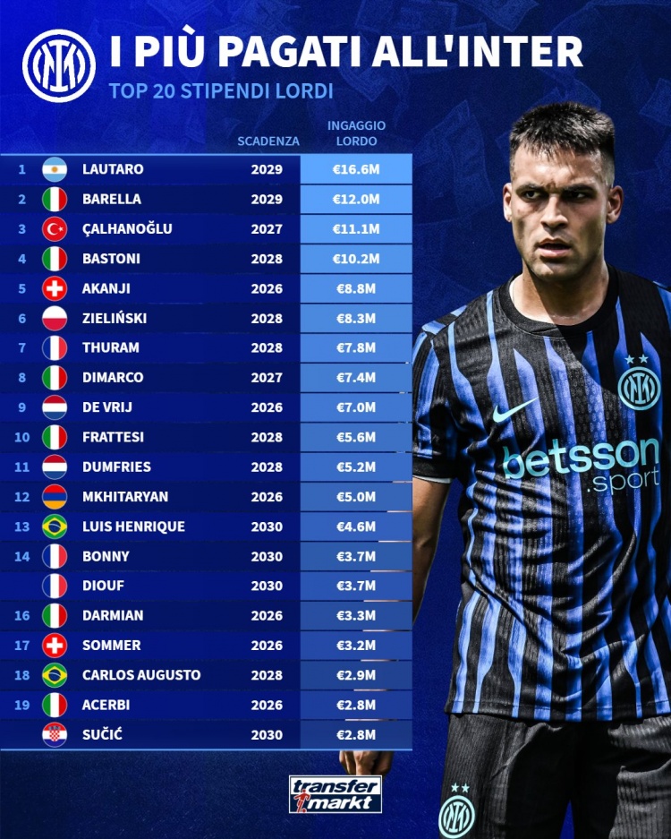国米税昨年薪名次:劳塔罗1660万欧居首,四名球员超1000万欧