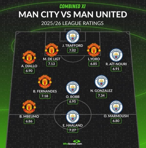 曼市德比本赛季评分最高阵:哈兰德领衔曼城6东说念主,姆伯莫在列