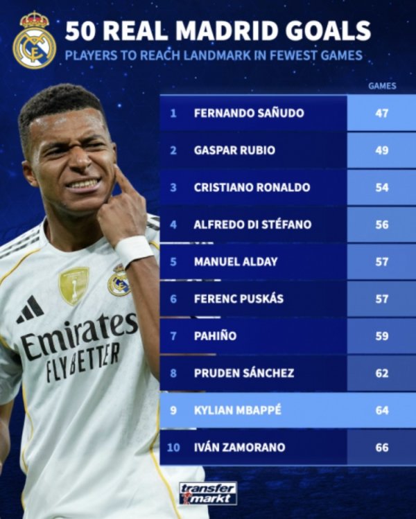 9月17日讯 姆巴佩在皇马欧冠对阵马赛的比赛完成双响,竣事皇马生存50球里程碑。 姆巴佩打进50球用了64场比赛,在皇骑兵史排名第9。 皇骑兵史50球场次名次榜: 1-费尔南多-萨努多 47场 2-加斯帕-卢比奥 49场 3-C罗 54场 4-迪斯蒂法诺 56场 5-曼努埃尔-阿尔达伊 57场 6-普斯卡什 57场 7-帕西尼奥 59场 8-普雷登-桑切斯 62场 9-姆巴佩 64场 10-伊万-萨莫拉诺......查看更多