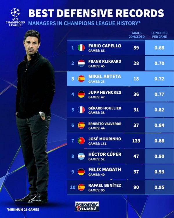 阿尔特塔带阿森纳插足25场欧冠仅丢18球,场均0.72球排在历史第三