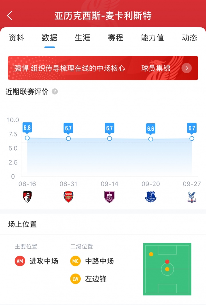 麦卡利斯特本赛季开赛后,阐发平平。现在2个月来的英超比赛以及两场欧冠比赛莫得一场媒体评分达到7分。