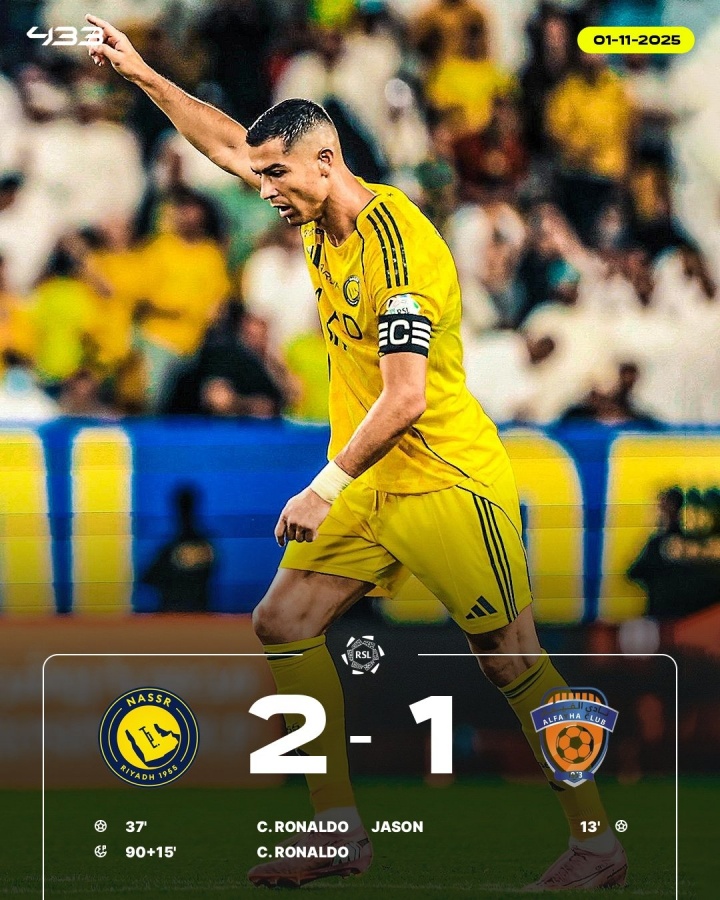 11月1日晚上的沙特联第7轮,利雅得成效主场2-1逆转费哈,C罗双响+第104分钟点射绝杀。