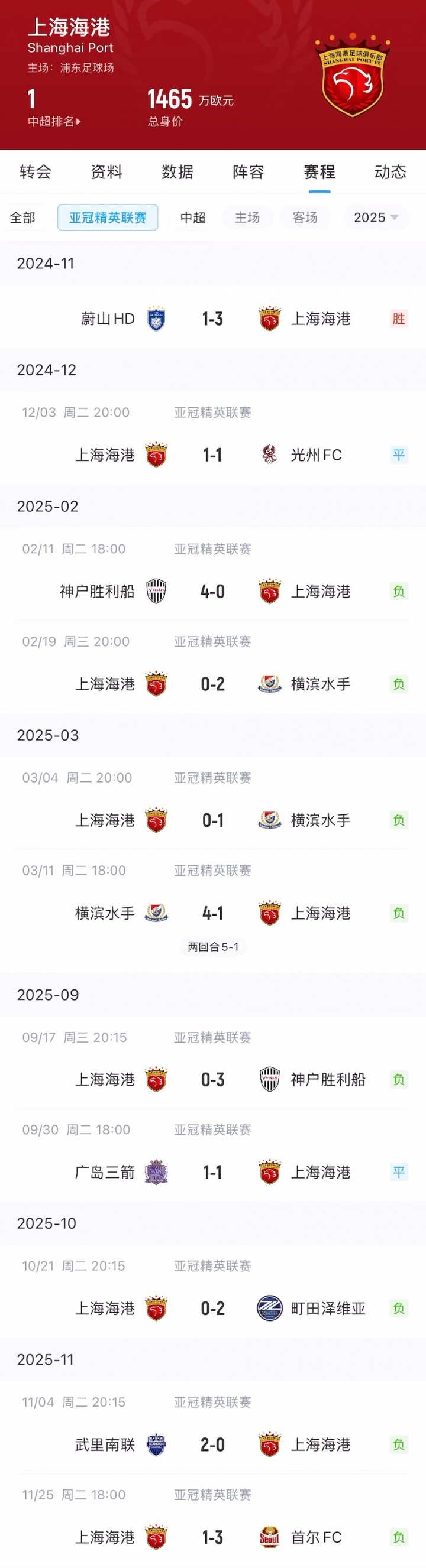 11月25日讯 亚冠精英联赛东亚区第5轮,上海海港主场1-3不敌首尔FC,亚冠跨赛季已链接10场未始胜绩。