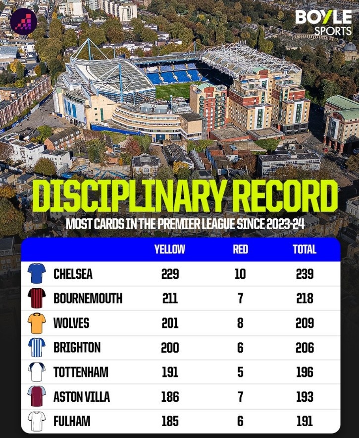 自23/24赛季英超吃牌榜:切尔西229黄10红,两项数据均为最多