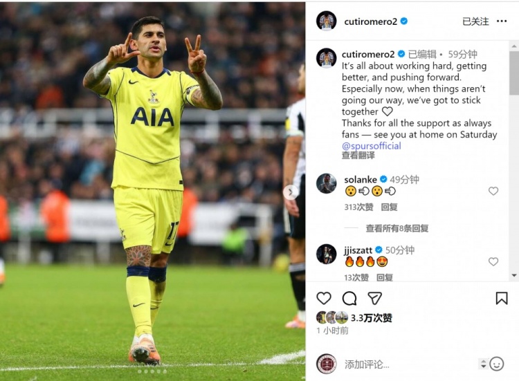 12月3日讯 英超第14轮比赛,罗梅罗打进2球,包括1粒倒钩绝平进球,匡助热刺客场2-2战平纽卡。