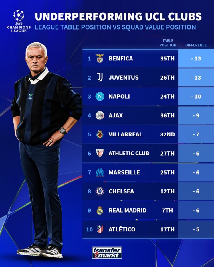 11月6日讯 德国转会市集把柄球队现在欧冠排行与阵存身价排行的差距,列出了本赛季欧冠发达欠安球队榜,本菲卡、尤文最差。