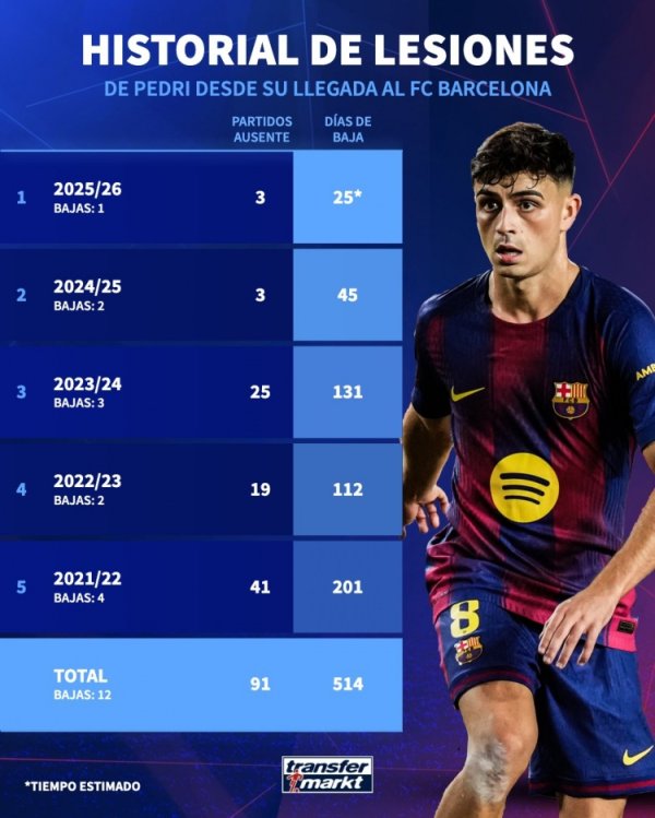 再次受伤!佩德里近5个赛季受伤休战12次,缺席91场比赛、514天
