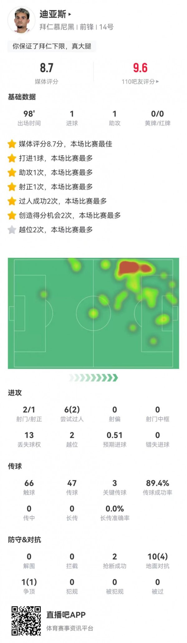 11月30日讯 拜仁在本轮德甲3-1逆转圣保利,迪亚斯本场数据如下: 首发踢满全场 1助攻 1球 2射1正 6过东说念主2奏效 13丢失球权 2越位 预期进球0.51 66触球 47传球,奏遵循89.4% 3关节传球 2抢断 11抵挡、5奏效 获评8.7分全场最高......查看更多