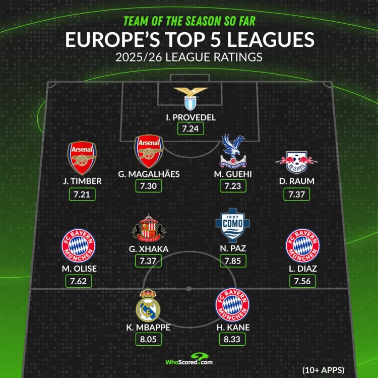 WhoScored本赛季于今五大联赛最好阵:姆巴佩、凯恩、扎卡在列