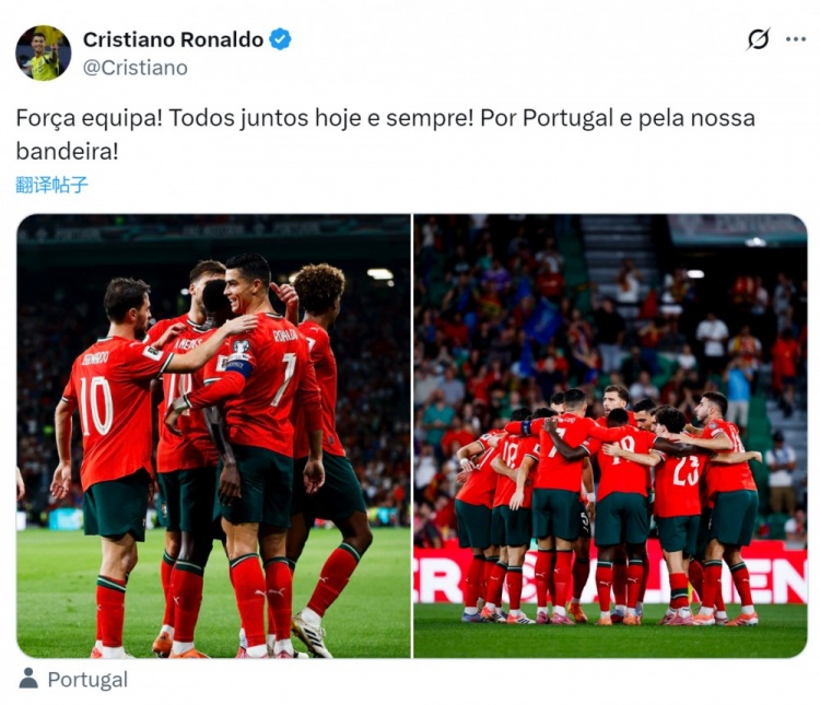 停赛缺席,C罗社媒为队友加油:咱们配合一心,为葡萄牙而战!