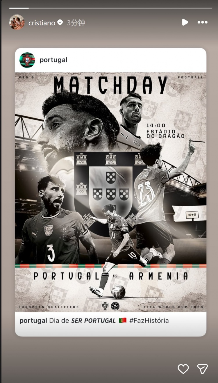 C罗上轮比赛肘击染红,此役停赛,他在酬酢媒体上转发葡萄牙国度队的赛前海报,为球队加油。
