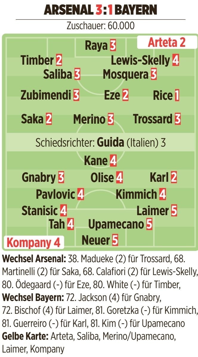 11月27日讯 拜仁在本轮欧冠客场1-3不敌阿森纳,《图片报》在赛后为两队将帅评分。