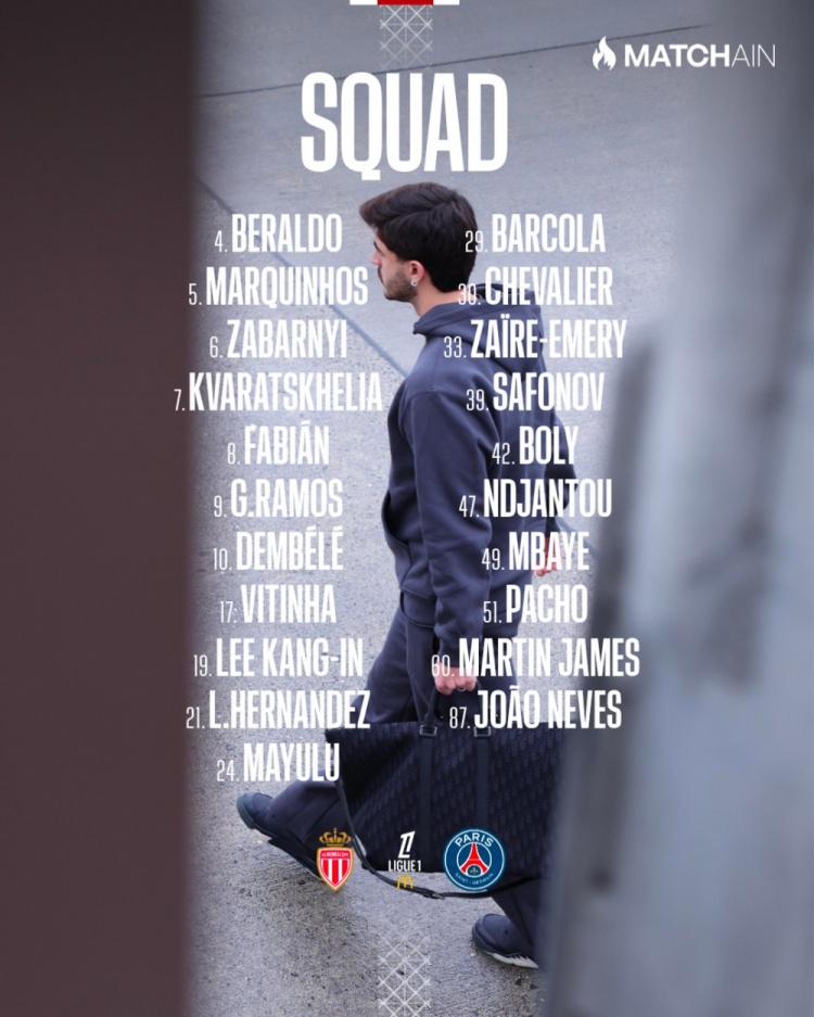 时尚:7-克瓦拉茨赫利亚、9-贡萨洛·拉莫斯、10-登贝莱、19-李刚仁、29-巴尔科拉、47-恩贾恩图、49-姆巴耶