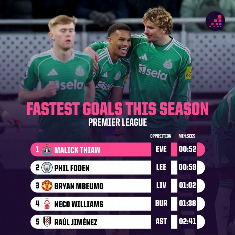 11月30日讯 纽卡在本轮英超对阵埃弗顿,佳夫为客队闪击立功。数据统计涌现,他也糟蹋了福登的本赛季英超最快进球记录。