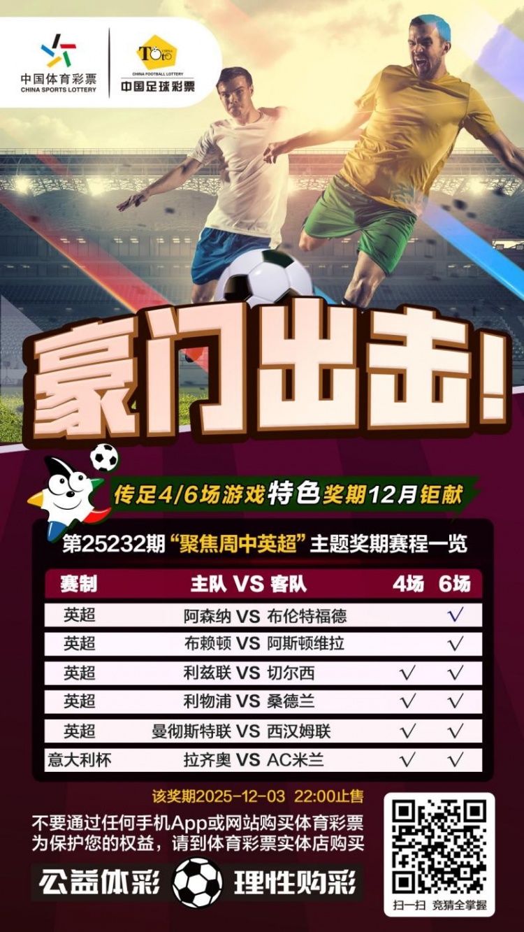 第25232期传足4/6场游戏特质奖期仍是于2025年11月30日20:00开售,将于2025年12月3日22:00停售,并于12月05日开奖,其中利兹联VS切尔西、利物浦VS桑德兰、曼彻斯特联VS西汉姆联和拉皆奥VSAC米兰为4场进球游戏竞猜赛事。