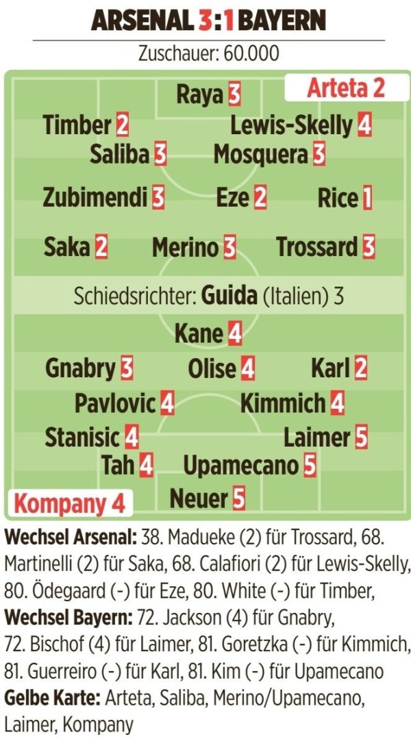 11月27日讯 拜仁在本轮欧冠客场1-3不敌阿森纳,《图片报》在赛后为两队将帅评分。 德国评分:1分最好、5分最差 阿森纳首发:拉亚3分、廷伯2分、萨利巴3分、莫斯克拉3分、斯凯利4分、苏维门迪3分、埃泽2分、赖斯1分、萨卡2分、特罗萨德3分、梅里诺3分 阿森纳替补:马杜埃凯2分、马丁内利2分、卡拉菲奥里2分、厄德高(未评分)、本-怀特(未评分) 阿森纳主帅:阿尔特塔2分 裁判:圭达(意大利)3分 拜仁首发:诺伊尔5分、斯坦尼西奇4分、塔4分、于帕梅卡诺5分、莱默尔5分、帕夫......查看更多