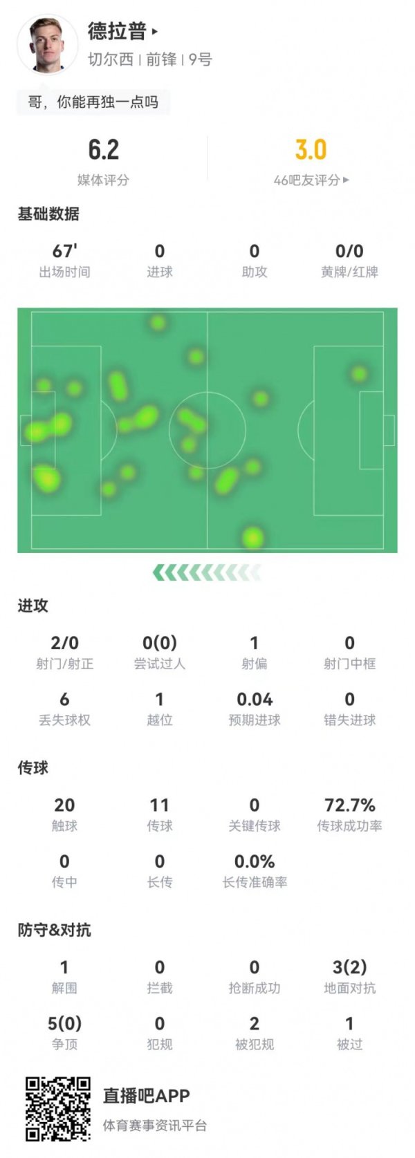 还得练!德拉普本场2射0正+5争顶0成效+2造犯规,获6.2分全队最低