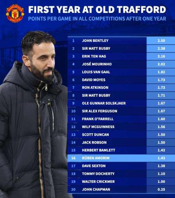 曼联主帅捏教首年场均拿分榜:滕帅、穆帅列三四,阿莫林第16