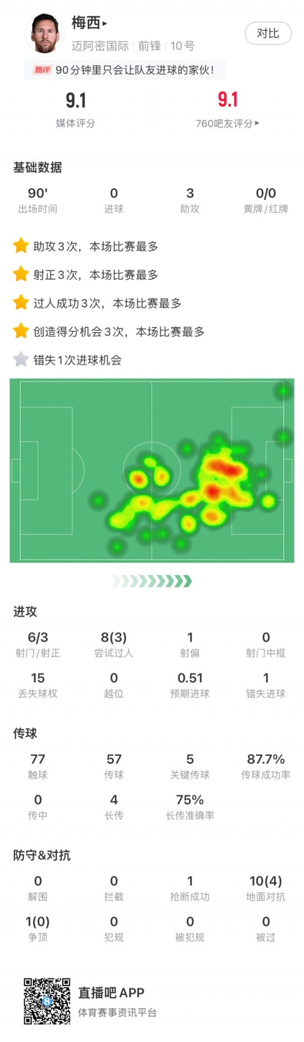 梅西本场数据:助攻戴帽,1次错失得分契机,媒体评分9.1分