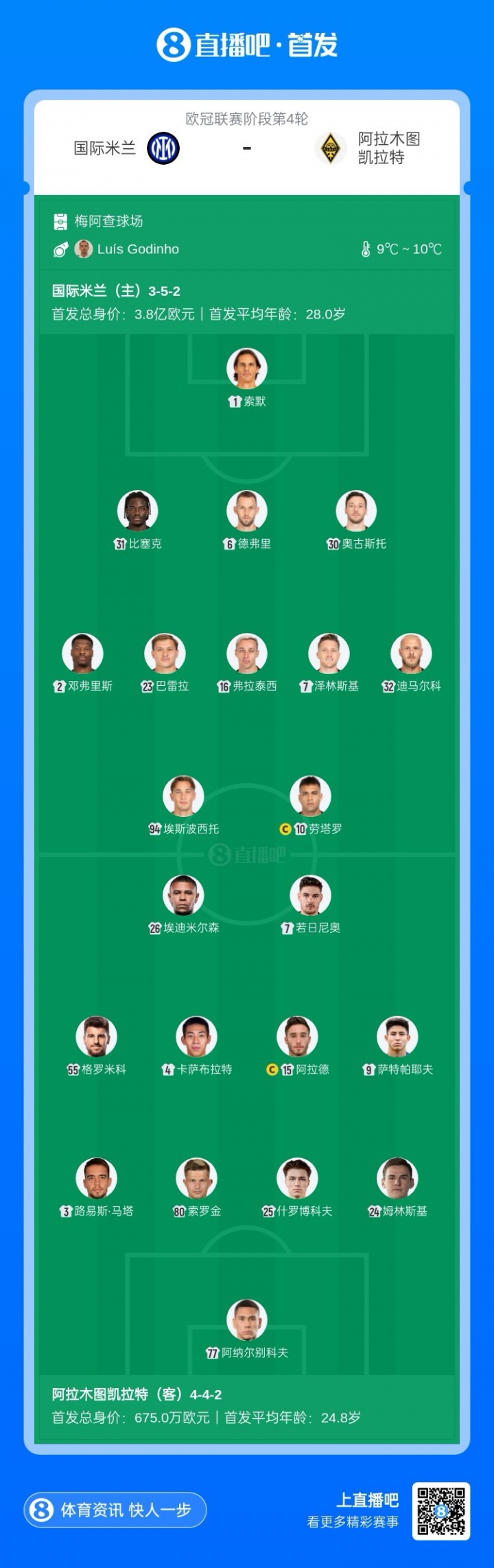 11月6日讯 欧冠第4轮,国米主场迎战阿拉木图凯拉特比赛行将打响。赛前首发出炉。