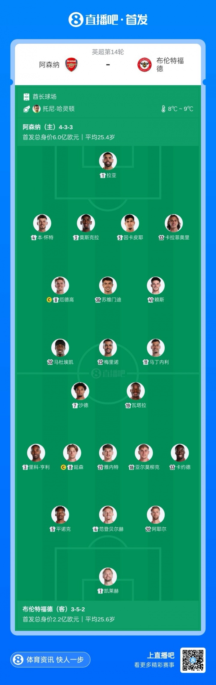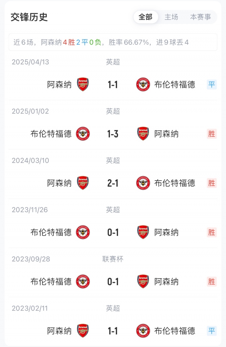 阿森纳联赛9胜3平1负积30分暂居英超榜首,各项赛事已聚合17场不败;布伦特福德联赛6胜1平6负积19分暂位英超第12,各项赛事近7场2负。阿森纳对阵布伦特福德已聚合9场不败(7胜2平),主场对阵布伦特福德已87年保握不败。
