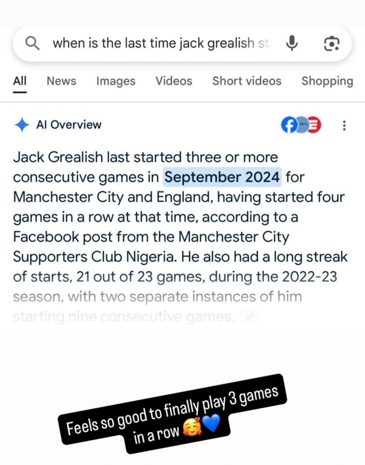 格拉利什通过社媒晒出了我方搜索我方前次贯穿3场首发的信息,流露他前次贯穿3场首发回是2024年9月。他对此点评谈:“终于又能贯穿3场首发的嗅觉真棒!”