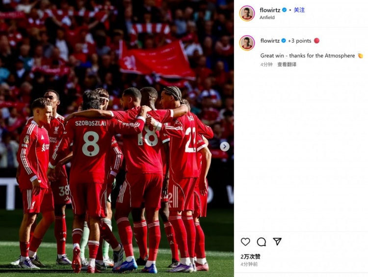 维尔茨也在赛后通过社媒晒出了全队庆祝照,并配文:“+3分!伟大的顺利!感谢主场激烈的氛围。”