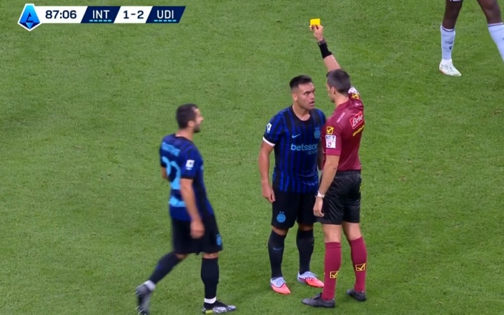 09月01日讯 国米vs乌迪内斯第87分钟,劳塔罗被吹犯规,劳塔罗十分不悦地向裁判质疑判罚,被裁判出示黄牌。