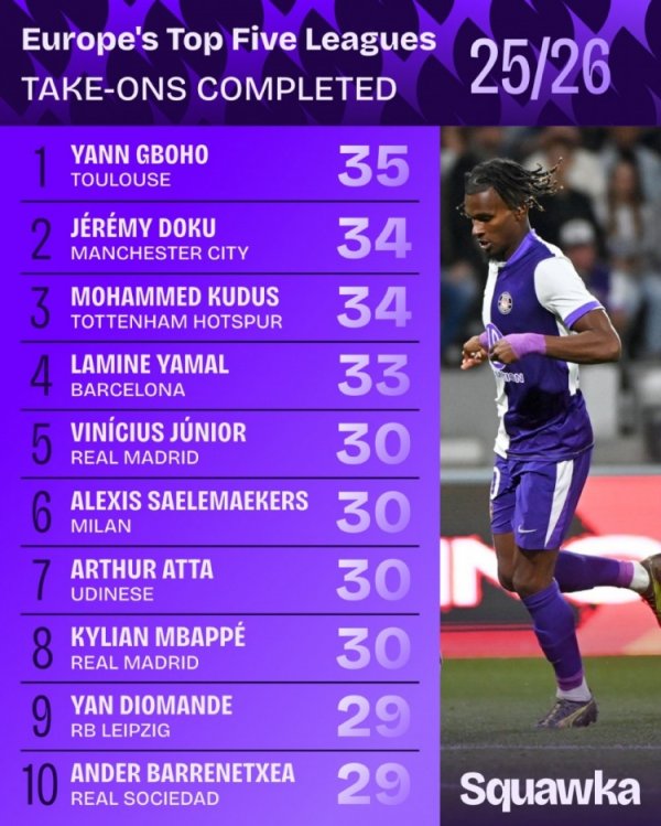 五大联赛成功过东谈主榜:多库、库杜斯均第二 亚马尔、维尼修斯在列