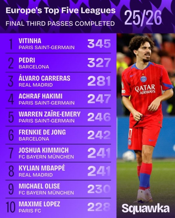 345次!维蒂尼亚的进攻三区完成传球次数位列五大联赛第一
