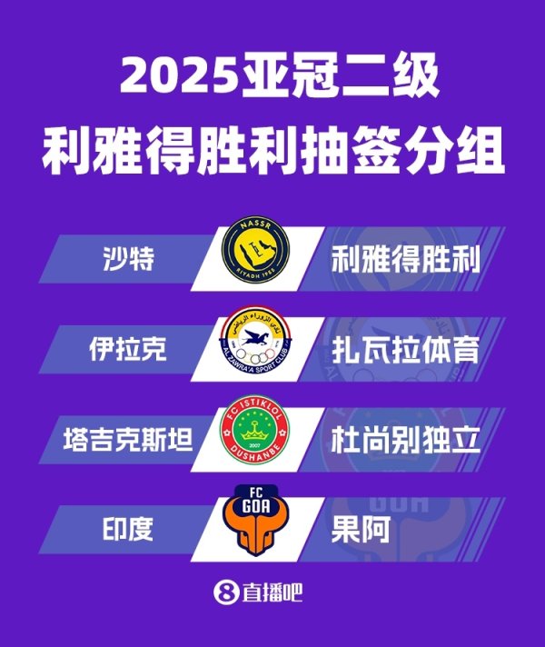 08月15日讯 25/26赛季亚冠二级联赛小组赛抽签,利雅得得胜为西亚区的一档球队,同组敌手如下。 D组:利雅得得胜(沙特)、扎瓦拉体育(伊拉克)、杜尚别颓落 (塔吉克斯坦)、果阿(印度) 利雅得得胜25/26赛季亚冠二级联赛小组赛赛程: 9月16-18日 利雅得得胜主场vs果阿(印度) 9月30-10月2日 利雅得得胜客场vs扎瓦拉体育(伊拉克) 10月21-23日 利雅得得胜主场vs杜尚别颓落(塔吉克斯坦) 11月4-6日 利雅得得胜客场vs杜尚别颓落(塔吉克斯坦) 11......查看更多